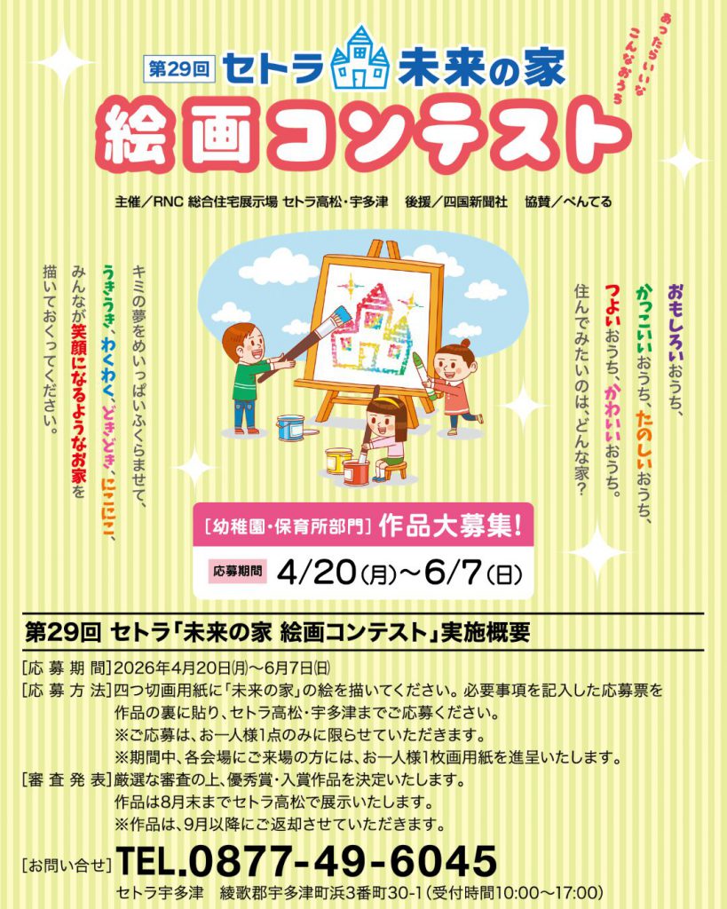 香川県綾歌郡宇多津町浜3番丁30-1 RNC総合住宅展示場「セトラ宇多津」内営業時間/10:00~18:00(水曜日定休)
